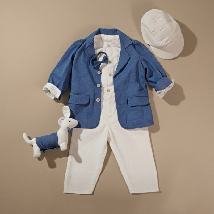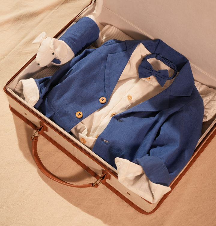 The "Firsts" are so important, and when its your little boy's first birthday, it has to be very special. Thoughtfully curated trousseau for the special day packed in a signature First Feather gift box. Ideal for gifting as occasion wear! The tailored cotton linen jacket has well constructed pockets, and fastens with wood buttons on the front. Fully lined, the comfortable trousers have a stretchy waistband with useful belt loops. The classic white cotton-linen shirt...